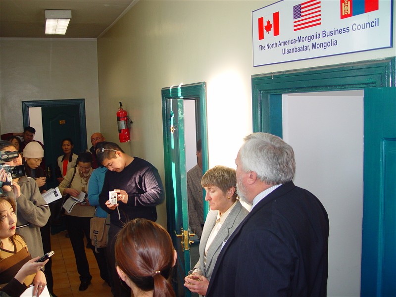 Meanwhile, at the NAMBC's 13th annual general meeting in Washington, DC, December 7-9, delegates elected Mr. J. Od, President of MCS Holding Company, as the first Mongolian citizen to serve on the Board of Directors. Od, a former Foreign Policy Advisor to two Mongolian Prime Ministers, took the seat vacated by the retirement of Mike Nikkel of AES. Chairman Jalsa Urubshurow and other officers and directors were reelected. The AGM's theme was "Towards a US-Mongolia FTA." The Mongolian government was ably and articulately represented by the Honorable Ts. Dashdorj, MP, a mining engineer who serves on the Ikh Hural's Standing Committee on Economic Policy, and Mr. D. Galsandorj, Director of Trade Policy & International Cooperation at the Ministry of Industry & Trade, who will be coordinating his ministry's role in the development of an FTA. Mongolian Ambassador to the US Ravdan Bold also spoke and personally hosted a reception in honor of the AGM delgates at the Mongolian Embassy, one of the highlights of the 3-day meeting. Other AGM speakers included Assistant Secretary of State Jim Kelly, Deputy Assistant USTR Charles Freeman, Washington lobbyist Mike Mitchell of Orion Strategies and three former US Ambassadors to Mongolia -- John Dinger, Joe Lake and Al La Porta. The new UB office space and the services of Ms. Bolor, the new office manager, were donated by SOCO International. Office furnishings, equipment, signage and supplies were contributed by Wagner Asia, Magic Suit Company, Anod Bank, Santis Educational Services, Ag Bank and SOCO. At the opening ceremony Ambassador Slutz commented, "I am delighted that the North America Mongolia Business Group is opening an office in Ulaanbaatar. This office will become a center for improving the business and investment climate here. We are proud to share in this event and look forward to fruitful cooperation. " The NAMBC is chaired by Jalsa Urubshurow, a Mongolian-American, one of the Council's original founders in 1990 and CEO of Nomadic Expeditions. Urubshurow said the new office is "both a symbol and a manifestation of the strong commitment to Mongolia and confidence in Mongolia shared by Canadian and American investors. " NAMBC Vice Chairman Ed Story, CEO of SOCO International, the largest single investor in Mongolia, called the office opening "a big step forward that shortens the distances between Ulaanbaatar, Ottawa and Washington. " Steve Saunders, president of the NAMBC, commented, "One reason we set up this office is because the Mongolian Government is the most accessible government in Asia, with leaders who sincerely encourage two-way dialogue with the foreign business community. This office will help expand that dialogue." "NAMBC is an organization of both foreign and Mongolian businesses that strongly advocates for increased trade and investment in Mongolia," said Pete Morrow, CEO of the Agricultural Bank, who heads the NAMBC's local activities in Mongolia. "This new office will coordinate our many efforts to work with the Government and the public for improved policies that translate into jobs and economic growth." The local office of the NAMBC has organized Working Groups on Mining, Business Climate and the US-Mongolia FTA. The UB-based NAMBC meets monthly. For details on the Working Groups, contact Pete Morrow, [email protected]; on the monthly meetings, contact Doug McGay, [email protected] Several Mongolian companies have recently joined the NAMBC as voting members, including Capital Bank, Agricultural Bank, Anod Bank, the Institute of Finance and Economics, Star-Melchers and MCS Holding Company. North American Members include SOCO Oil, Wagner Asia, Nomadic Expeditions, Coca Cola Company, Boeing, Caterpillar, Ivanhoe Mines, Cameco, International Uranium, the Asia Foundation, Gallant Minerals and others with business interests in Mongolia. |